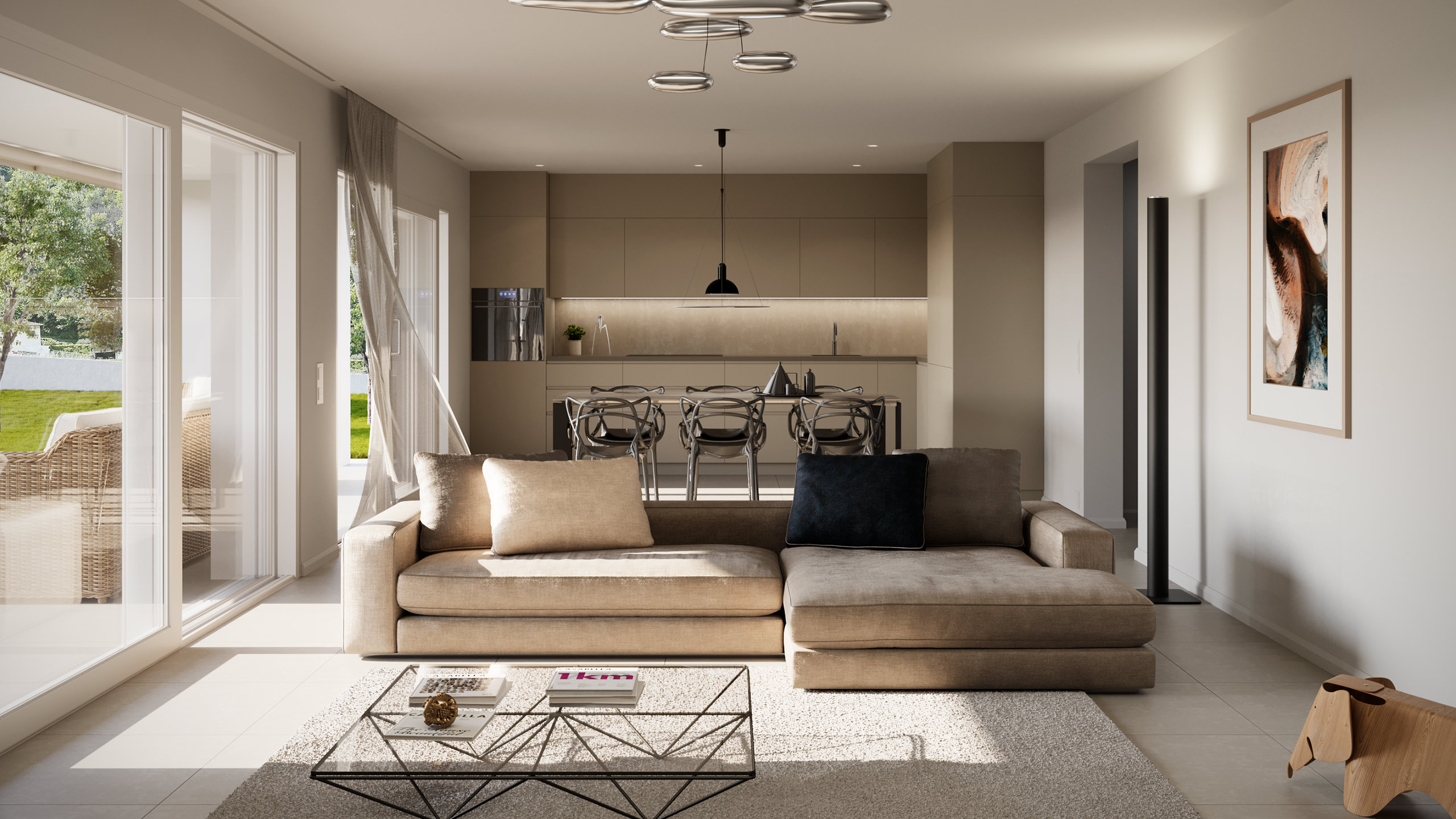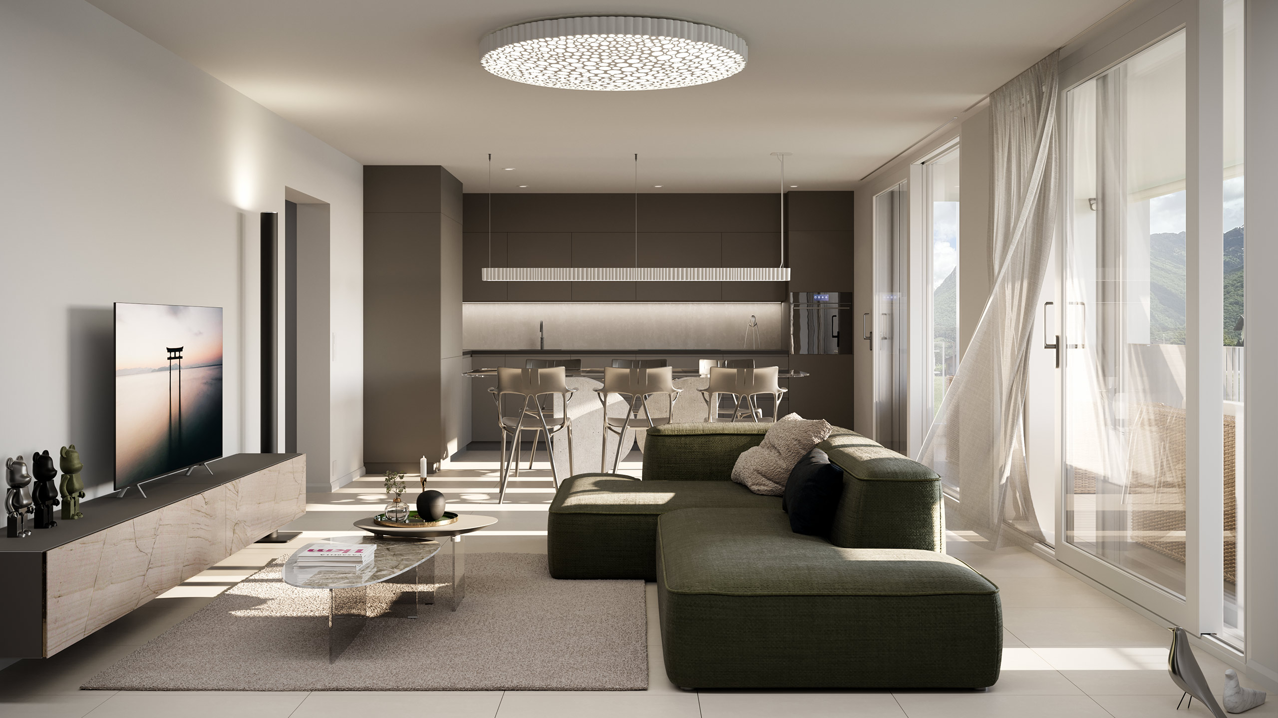 Camere da letto spaziose, soggiorni aperti e luminosi, doppi servizi per gli appartamenti di 3.5 e 4.5 locali, spazioso atrio entrata con armadi, garantiscono confort e benessere. Non da ultimo, un locale lavanderia privato completo di colonna lava-asciuga e lavello.