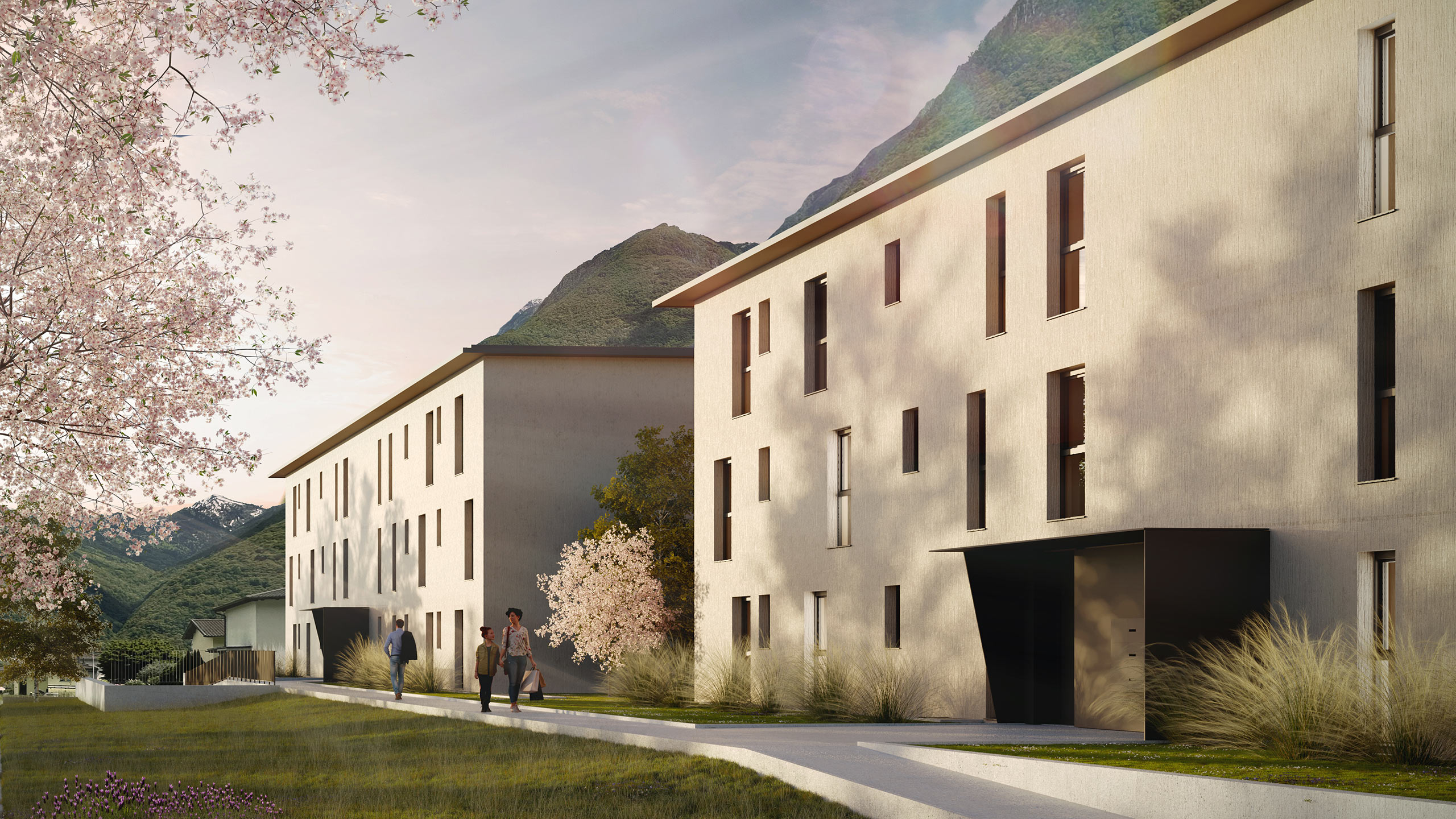 Gli stabili si sviluppano su tre livelli fuori terra, collegati tra loro dal piano interrato che funge da autorimessa in comune e accoglie i locali dedicati alla tecnica e le cantine, nonché locale biciclette e rifugio della protezione civile.